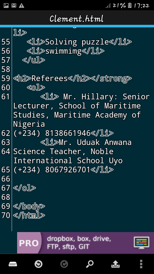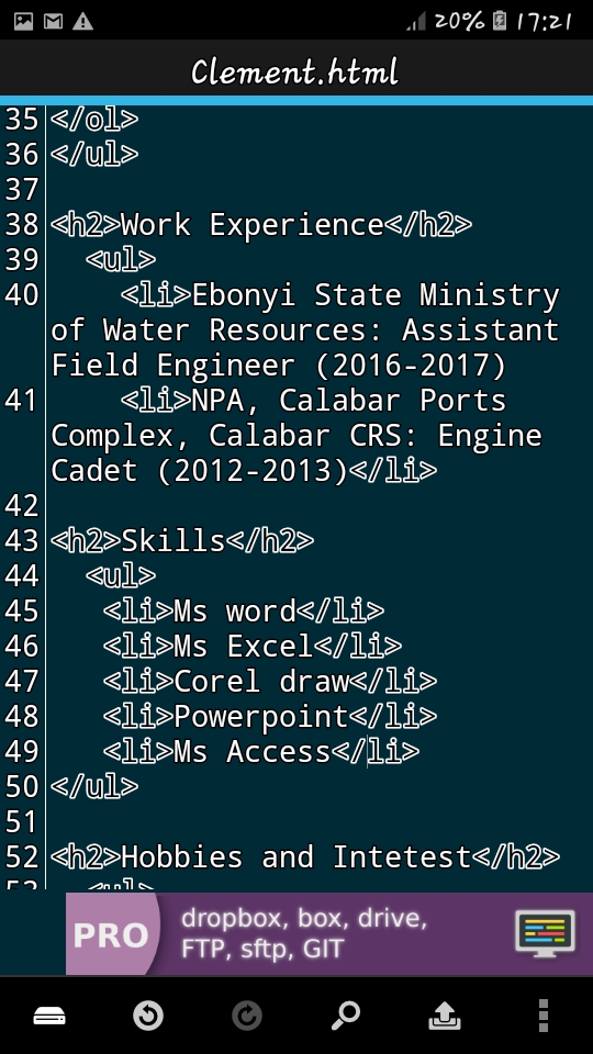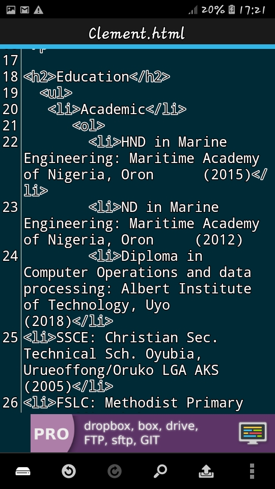I have been able to create a single html page containing the content of my CV well arranged. I have learned about some common html terms such as element, tag, div, head, body, tiltle etc. Learned some skills like how to open and close tags, create ordered/unordered list, input, tables, comment, html document structure and lot more and still counting. It has’nt been a dole moment with @startdotng. Thank you guys for the great job thus far. The progress I have made so far is simply amazing.